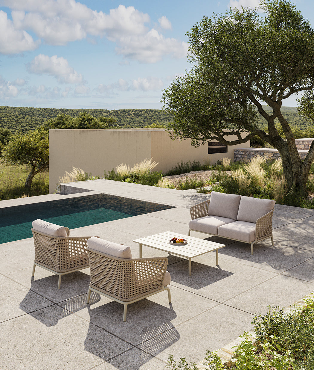 The refined Abrazo collection is renowned for its classic elegance and lightness. Characterised by organic lines and hand-woven, weather resistant rope detail, the softness of the robust seat and back cushions complement the strength and durability of the aluminium or teak frame.