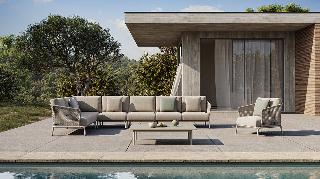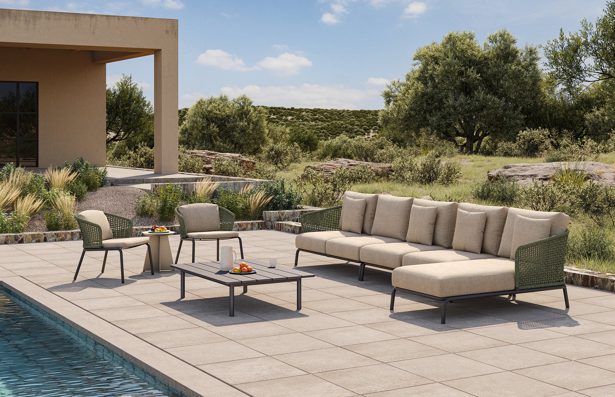 The refined Abrazo collection is renowned for its classic elegance and lightness. Characterised by organic lines and hand-woven, weather resistant rope detail, the softness of the robust seat and back cushions complement the strength and durability of the aluminium frame.