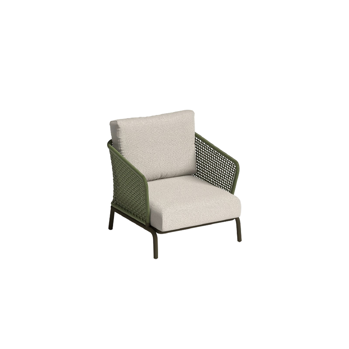 Frame: aluminium with Tiger powder coating. Backrest woven rope with aluminum plate seat + 1 piece seat cushion and 1 piece back cushion