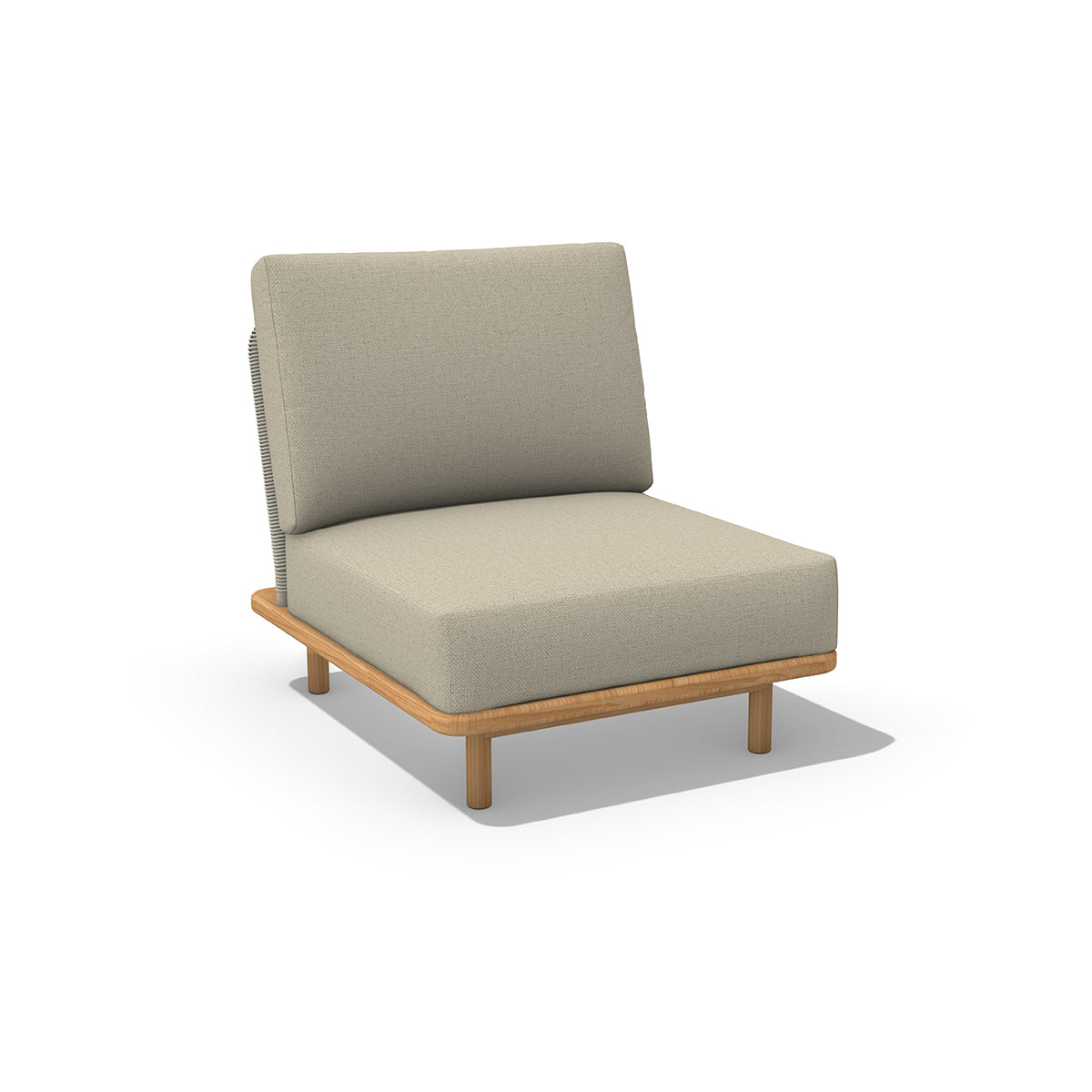 Frame: aluminium with Tiger powder coating. Backrest woven rope with teak base with 1 seat cushion + 1 back cushion