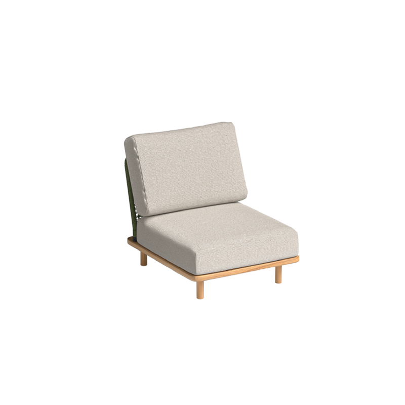 Frame: aluminium with Tiger powder coating. Backrest woven rope with teak base + 1 seat cushion + 1 back cushion