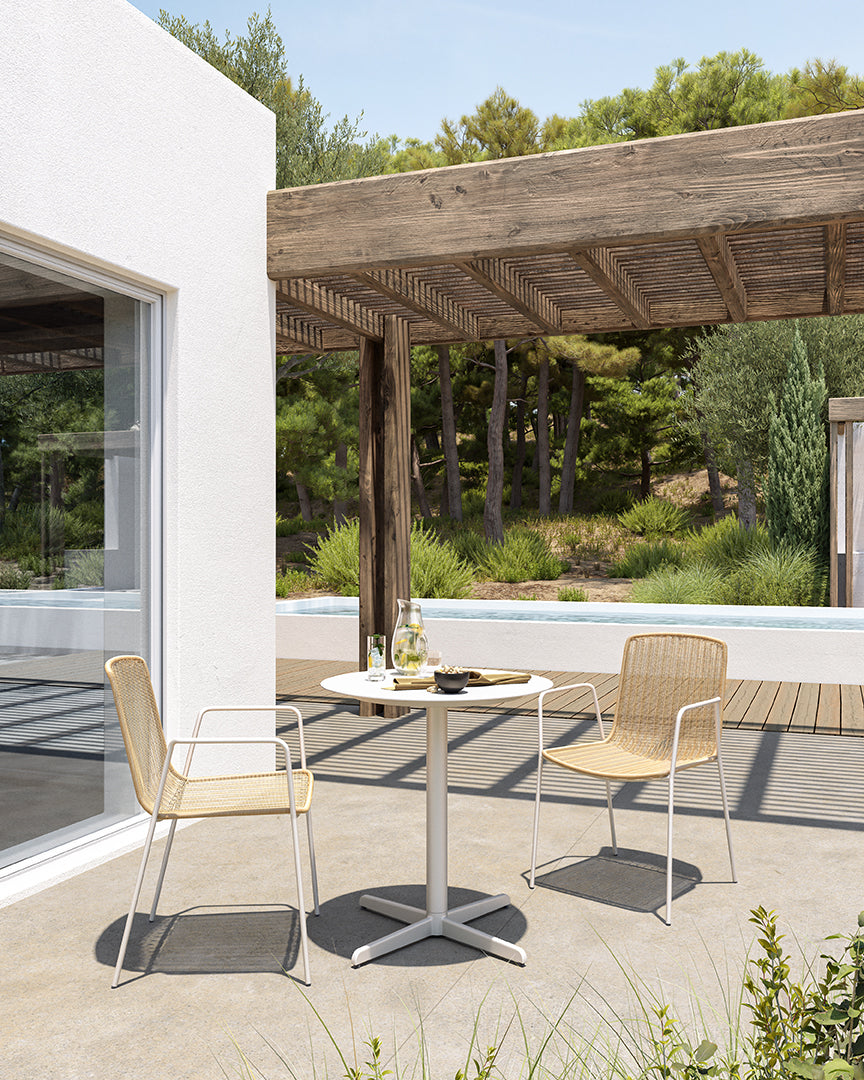 Bella is a comfortable and light outdoor collection that makes meetings even more pleasant. Thanks to its colors and geometry, it blends in with the environment. Its minimalist design doesn’t take away its resistance. The metal tube structure and the braiding of the seat provide great resistance, allowing their intensive use.