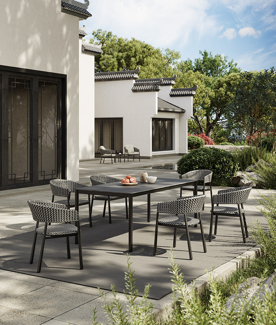 Frame: aluminium with Tiger powder coating, woven rope backrest with aluminium plate seat. Cushions optional