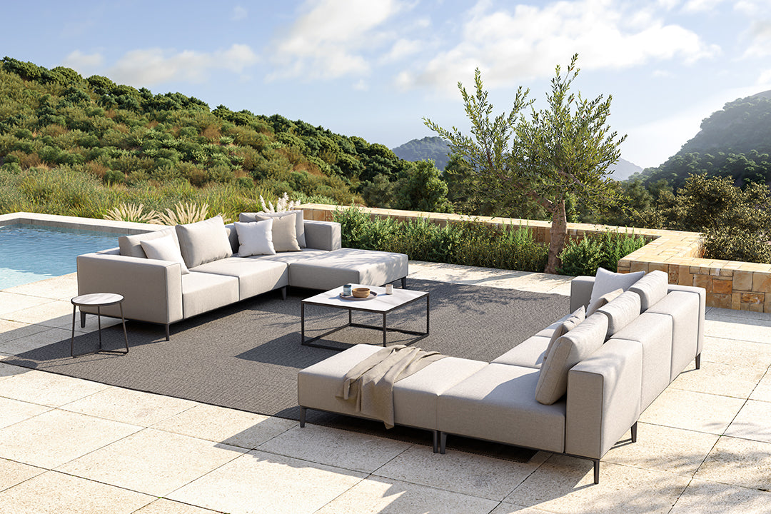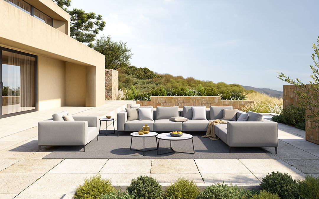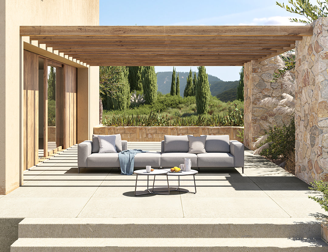 The Mani sofa features a sleek, minimalist design with oversized cushions for extra comfort. This modular series can be arranged in various configurations to suit different spaces and requirements. With its modern, understated style, the Mani sofa seamlessly integrates into both outdoor and indoor environments.