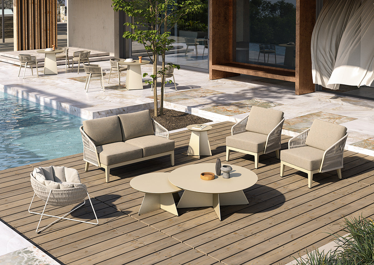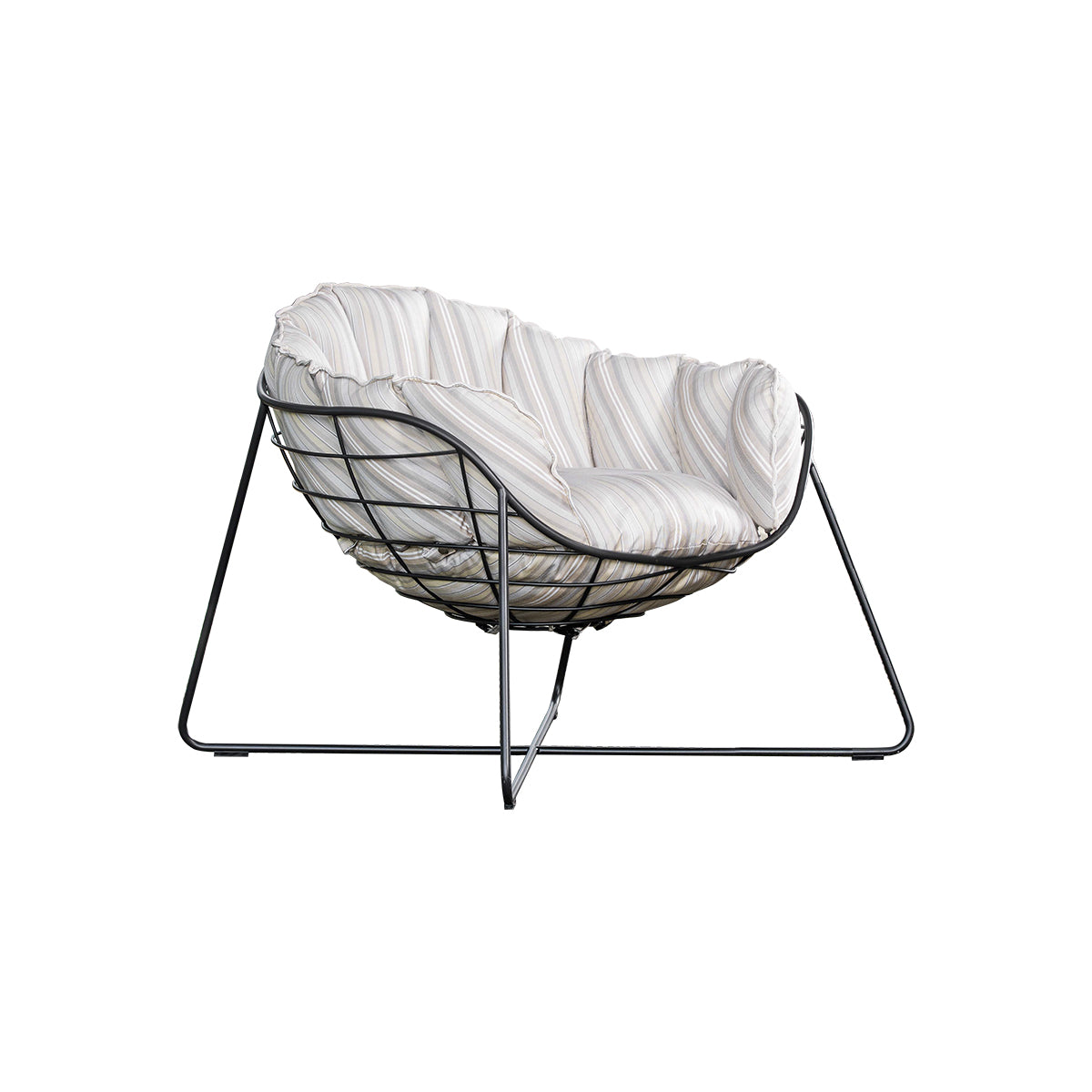 The woven surface wrapping the frames gives the Mars collection a steady, plump shape. Surrounded by the arms and backrest, the low seat delivers a sense of security to its user, and its design featuring low gravity, along with the soft shell-shaped back cushion, helps to create a more comfortable and cozy experience. What prop up the seat steadily are crisscrossing powder-coated, stainless-steel frames. In the Mars collection, rattan chairs, rope chairs, and swing chairs are available.