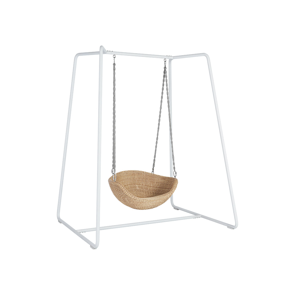 The weaved surface wrapping the frames gives the Mars collection a steady, plump shape. Surrounded by the arms and backrest, the low seat delivers a sense of security to its user, and its design featuring low gravity, along with the soft shell-shaped back cushion, helps to create a more comfortable and cozy experience. What prop up the seat steadily are crisscrossing powder-coated, stainless-steel frames. In the Mars collection, rattan chairs, rope chairs, and swing chairs are available.