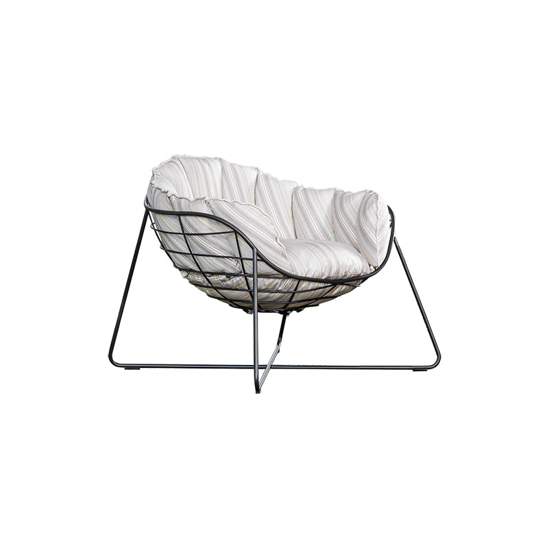 The weaved surface wrapping the frames gives the Mars collection a steady, plump shape. Surrounded by the arms and backrest, the low seat delivers a sense of security to its user, and its design featuring low gravity, along with the soft shell-shaped back cushion, helps to create a more comfortable and cozy experience. What prop up the seat steadily are crisscrossing powder-coated, stainless-steel frames. In the Mars collection, rattan chairs, rope chairs, and swing chairs are available.