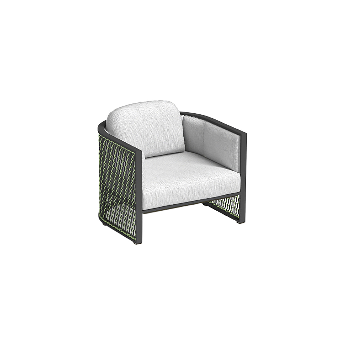 Frame: aluminium with Tiger powder coating and Aluminum mesh with woven rope + 1 seat cushion, plus a back and scatter cushion