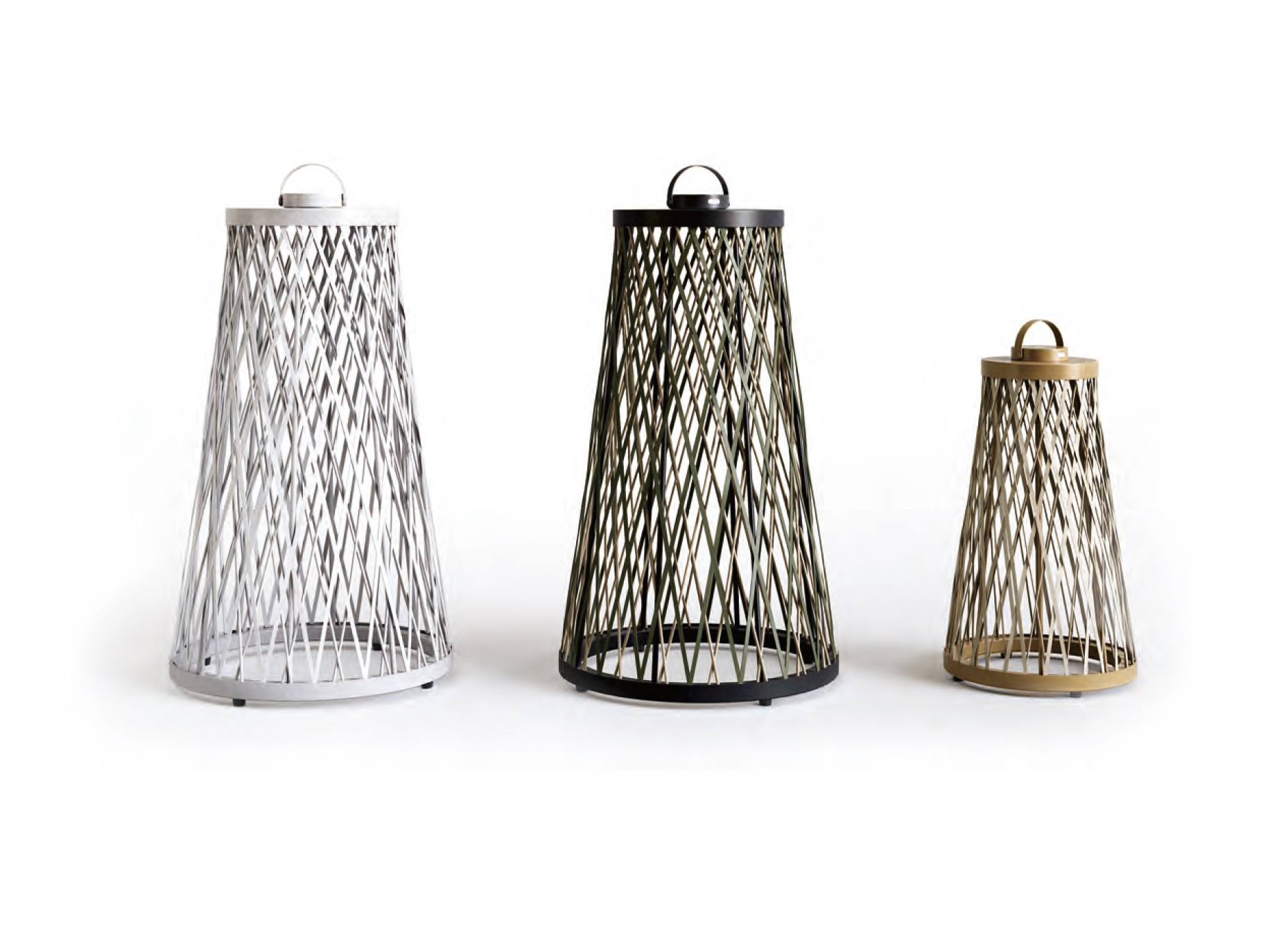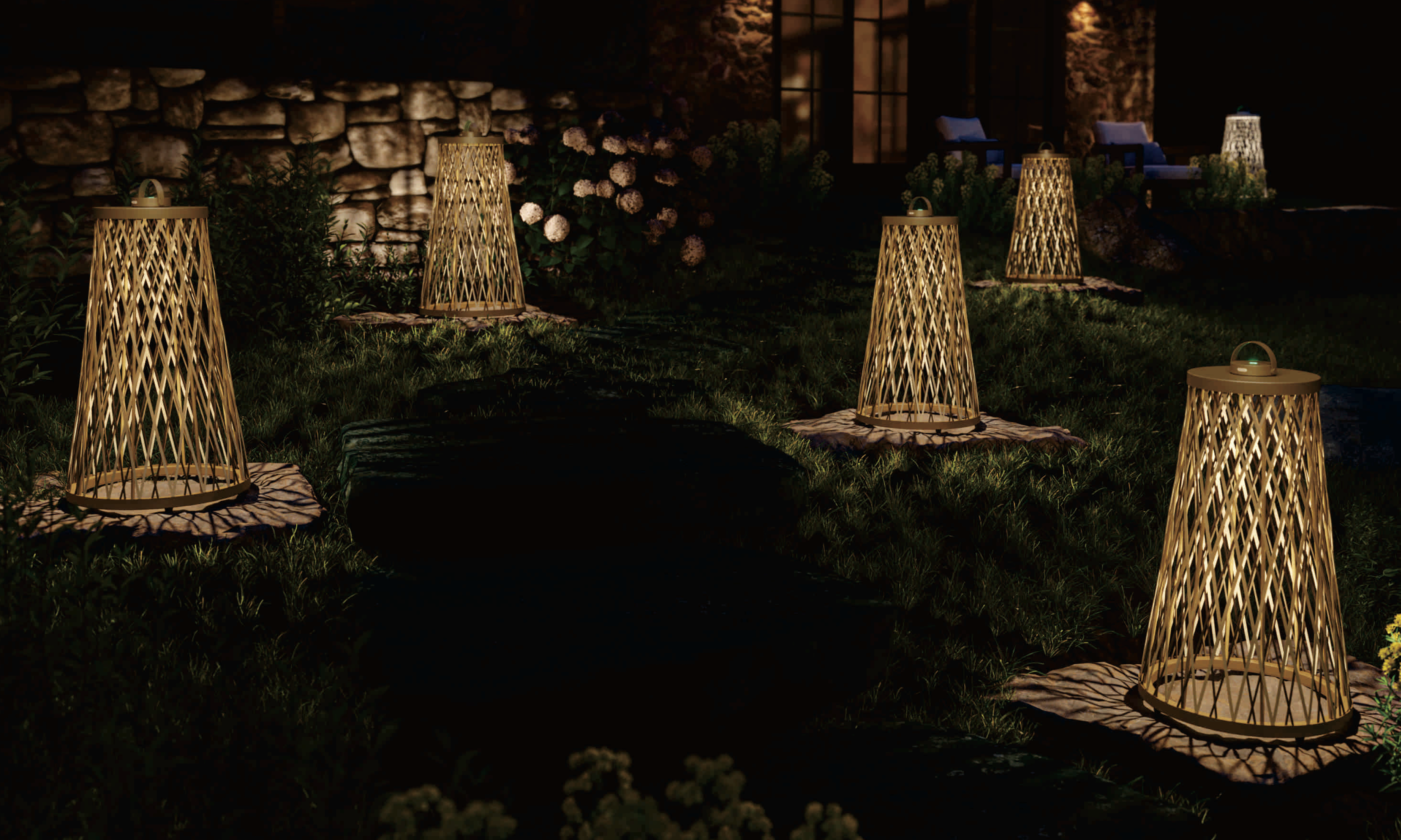 VINEKO Pharos features an aluminum base and frame, with rattan and metal interwoven into a diamond-patterned shade. Light subtly refracts through rattan, casting flowing geometric shadows that transform the static lamp into a dynamic play of light. IPSA Waterproof.